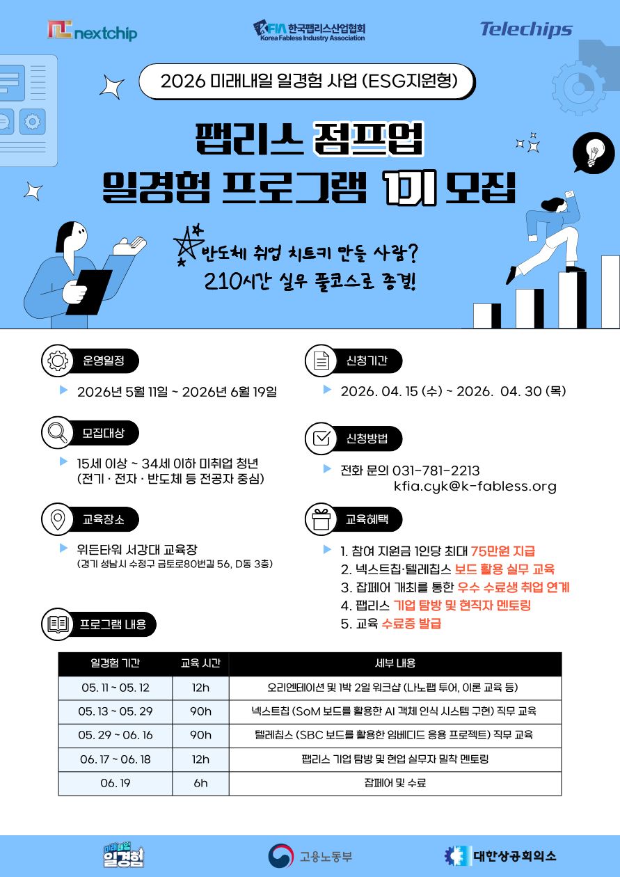 한국팹리스산업협회는 고용노동부 '미래내일 일경험(ESG지원형)' 사업의 일환으로, 반도체 설계 분야의 실무 역량을 갖춘 청년 인재를 양성하기 위한「팹리스 점프업 일경험 프로그램 1기」를 운영합니다.